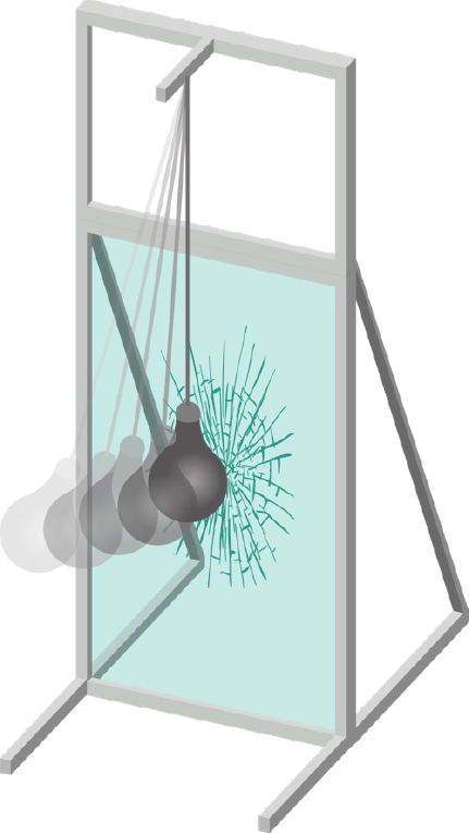 For safety glass, the codes stipulate a pendulum test to simulate glass subjected to human impact force. In general, the test involves impacting the glass sample with a specific weight that is dropped from a specific height. European standards use standard twin-tires while North American standards use a weighted bag to simulate a human body.