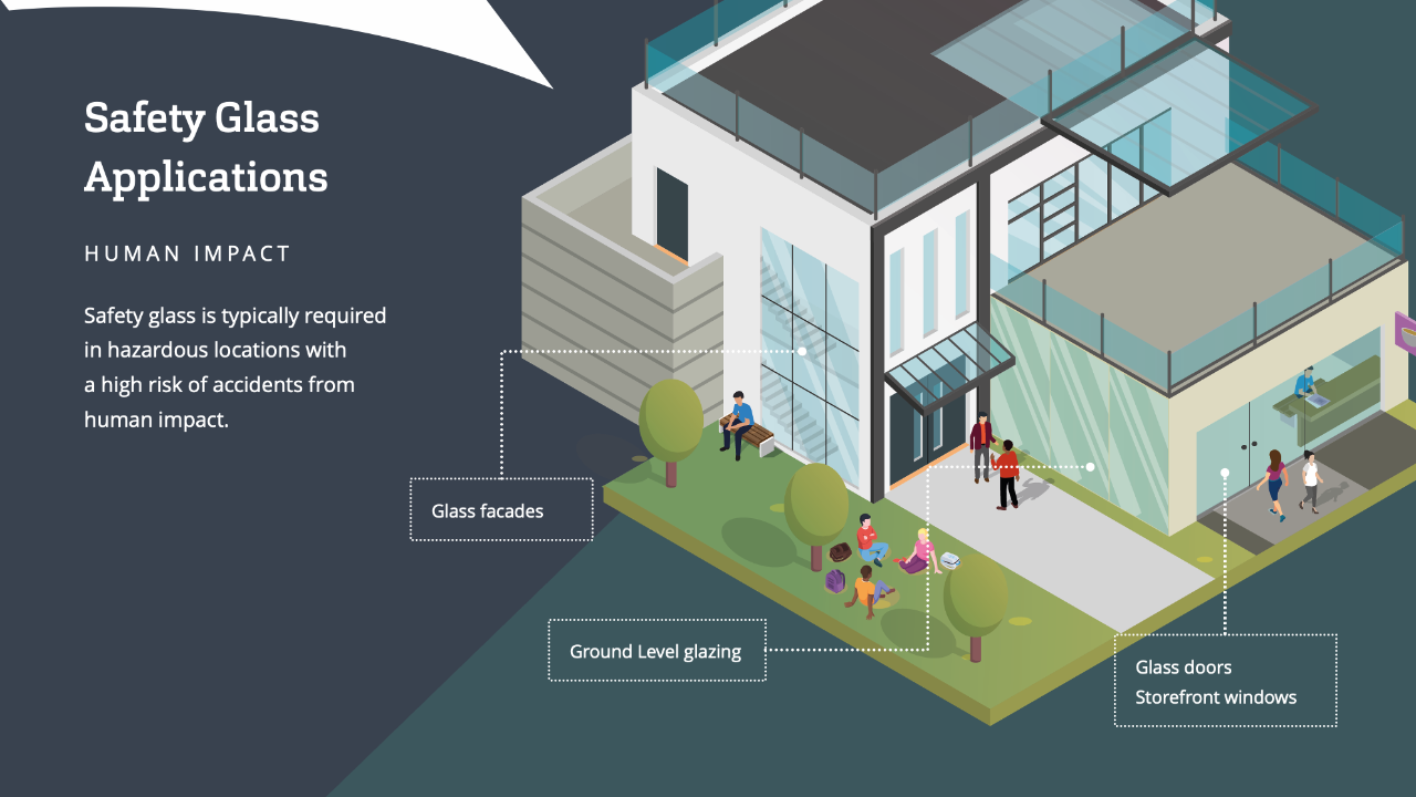 Safety glass is typically required in hazardous locations with a high risk of accidents from human impact. Typical applications are: