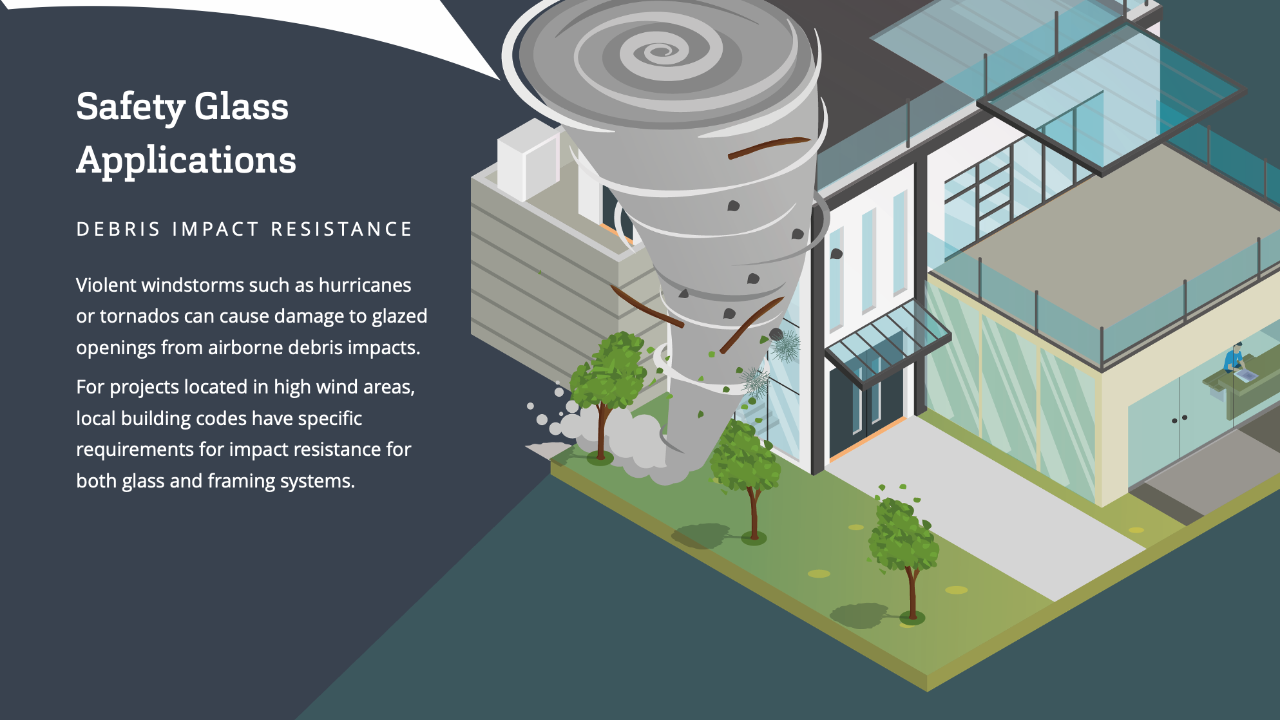 In addition to accidental impact, safety glass is recommended to minimize damage from natural causes. For example, violent windstorms such as hurricanes or tornados can cause damage to glazed openings from airborne debris impacts. For projects located in high wind areas, local building codes have specific requirements for impact resistance for both glass and framing systems.